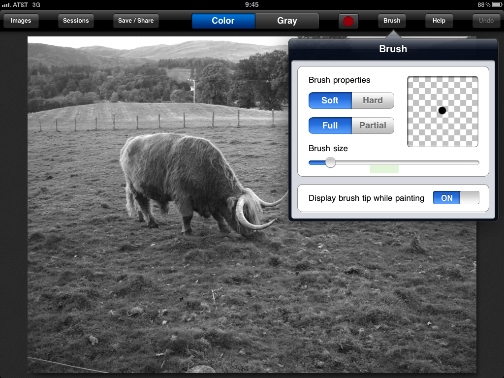 Test image with Brush menu displayed, also note the “Color” option selected in the menu.