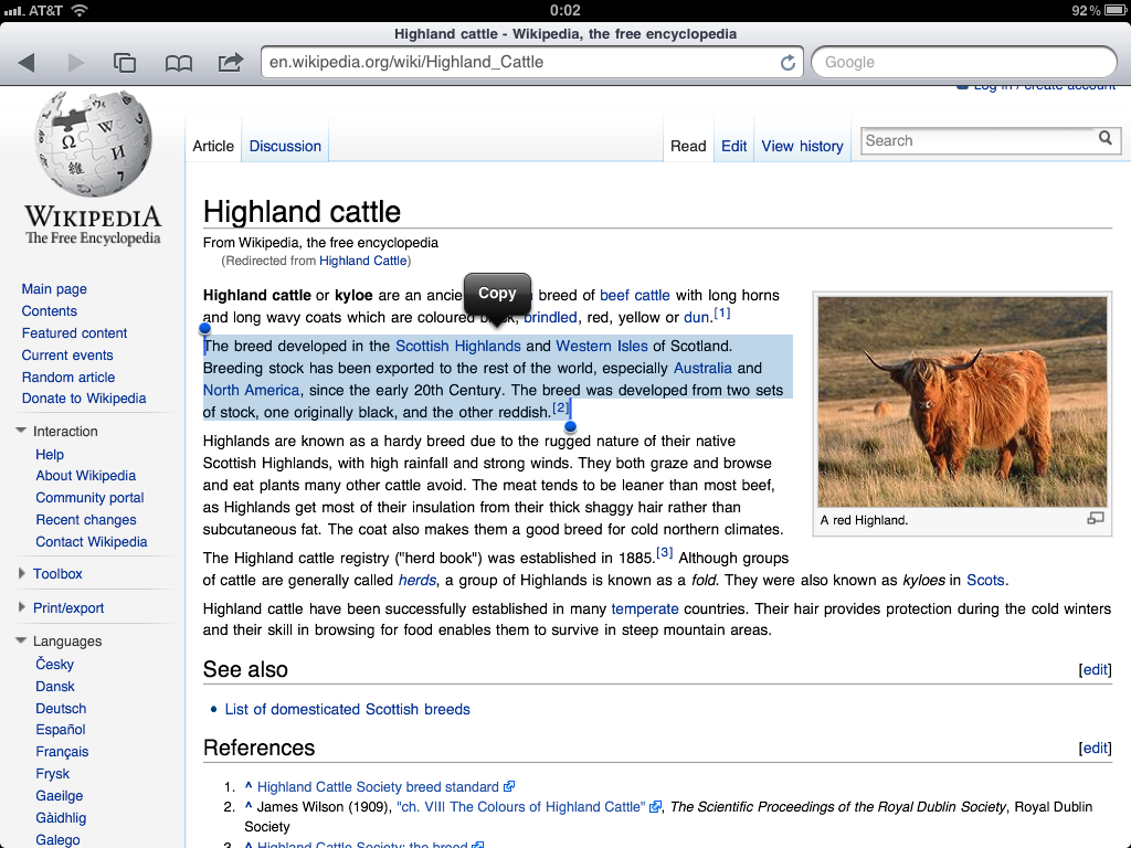 I searched on Wikipedia for information on Highland cattle and copying a selection of text to use in my Pages document.