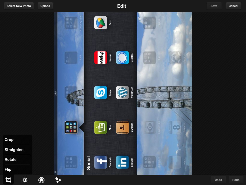 The menu I use most allows me to directly modify the size & orientation of photos. Since Adobe PS Express allows you to upload images to Facebook or send in a email message, many users find these options handy for everyday use.