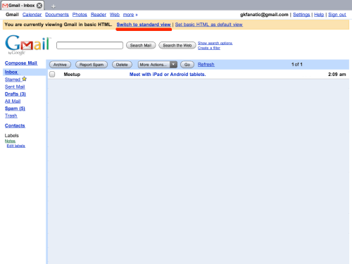 Turn the iPad portrait, this is so that more of the Gmail options will be visible, I found using the Pinch technique would size the browser to fill the screen properly from landscape to portrait viewing. Tap Switch to Standard view link at top if it is present: