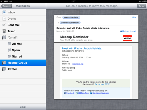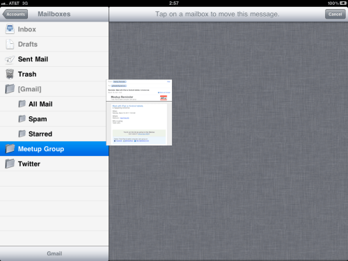 Mail will ask you which folder destination you desire your message to move to. Tap a folder on the left side of the screen to relocate message: