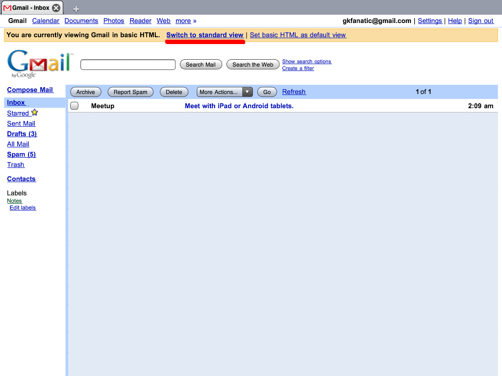 Turn the iPad portrait, this is so that more of the Gmail options will be visible, I found using the Pinch technique would size the browser to fill the screen properly from landscape to portrait viewing. Tap Switch to Standard view link at top if it is present: