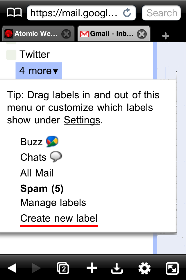 UPDATE March 28, 2011: I have found a way to do this without having to use Atomic Web Browser. Google Mail viewed using Safari on the iPad or iPhone supports a hidden option visible if you scroll to the bottom of your inbox message list at left called View Gmail in Desktop. Tap this link to view a screen shot of this well hidden feature. This means of course that you can tap this option using Safari, skipping the browser identity steps and start with the step beginning with: “Tap Create new Label“. Be sure you turn your iPad portrait so you will be able to see the label menu options.