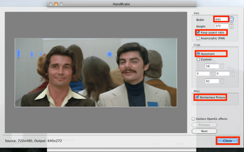 Change the Width to 640, and tick Keep aspect ratio. Do not adjust the Height. I also choose the Deinterlace Picture option although this is not required: