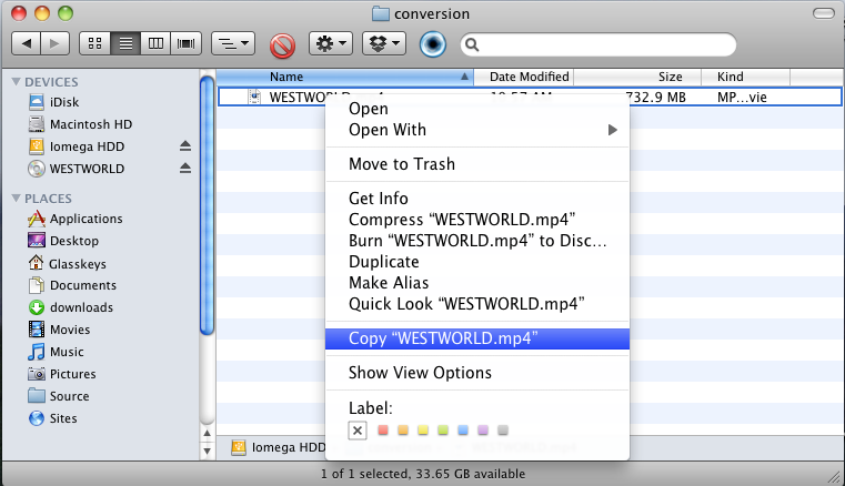 After Handbrake is finished, right-click the video file and choose Copy in Finder: