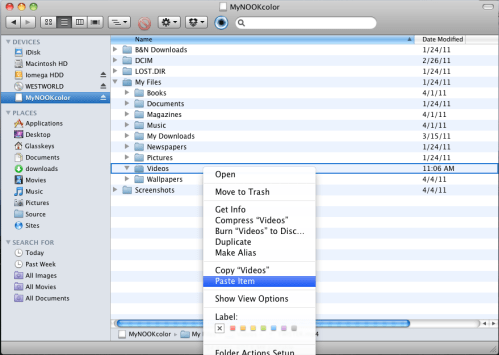 Connect your Nook Color to your Mac using the “special” USB cable and paste the movie file to the Nook Videos folder: