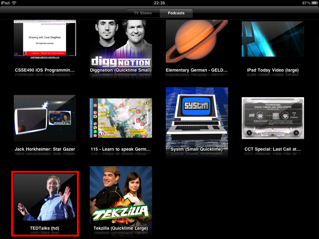 Tap the Podcasts tab at the top of the screen, then tap the video you wish to view.