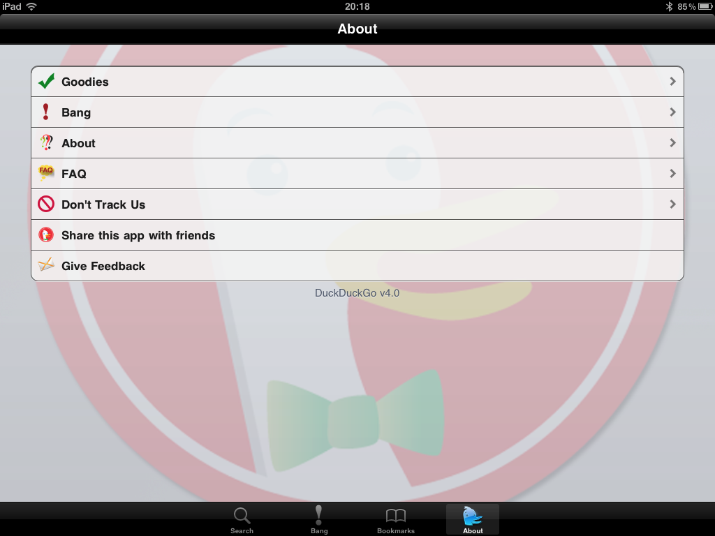 About tab selected, showing additional features and philosophy of DuckDuckGo.