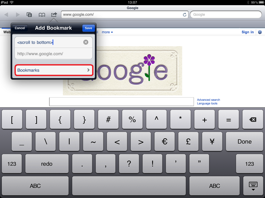 Name the google bookmark <Scroll to Bottom>, if you see Bookmarks at the bottom, tap it. The destination of this bookmark needs to be the bookmarks bar.