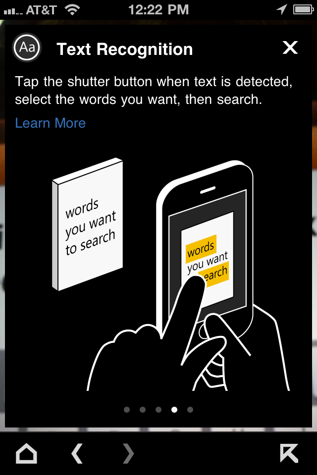 The Camera button also sports a text recognition feature. Words appear with a white border around them. When you tap a word box, it becomes highlighted and is placed in a search term field.