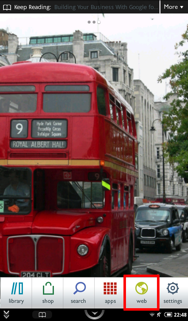 To begin open the Nook web browser with a tap of the Web button on the Nook menu: