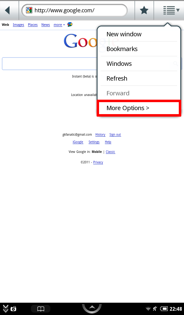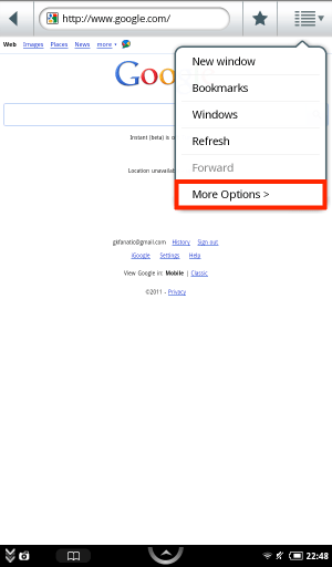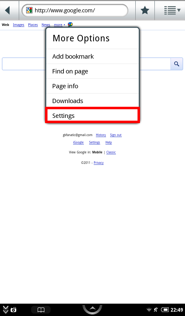 Next you will see the More Options menu appear. There is no rational reason to why the handful of functions in the “More Options” menu (very descriptive BTW) should not appear in the first options menu. This will be a mystery to all sans the headless corporate committee that designed this menu. Regardless, tap Settings after the More Options menu is shown: