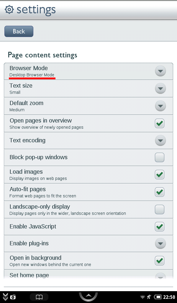 Tap the Desktop Browser Mode radio button if not selected (no green dot in centre):