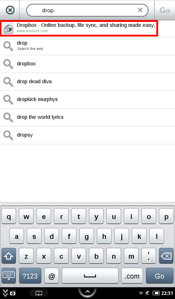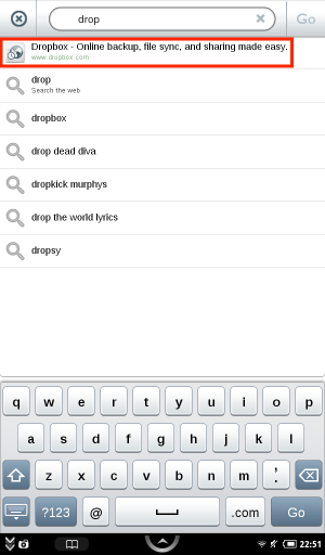 Tap the Back button until you are back to the browser and in the address bar type http://www.dropbox.com: