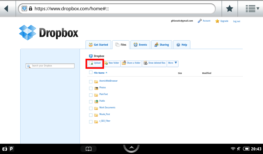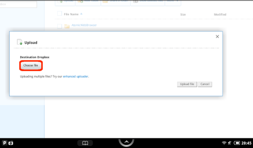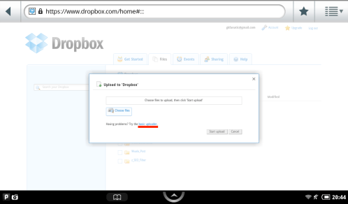 When the “Upload to Dropbox” window appears, tap the basic uploader link, the normal Dropbox upload mechanism does not work properly with the Nook Color browser. This of course means that you must select each upload file individually, instead of the richer multi-select functionality normally present with the default Dropbox web interface: