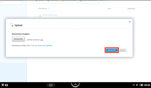 The Alarm_Buzzer.ogg should now be visible. If this is so, tap the blue Upload file button: