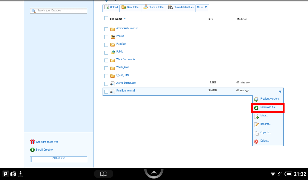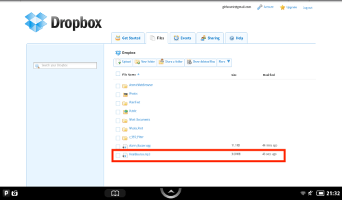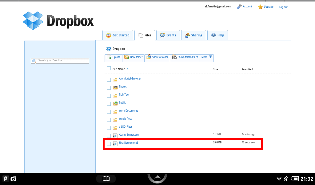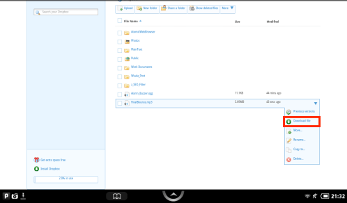 After upload the Alarm_Buzzer.ogg file is listed in Dropbox and is now available for download on another device: