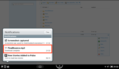 To download files from Dropbox to the Nook Color, tap the “line” the file resides. In this example I wish to download the FinalBounce.mp3 file to my Nook: