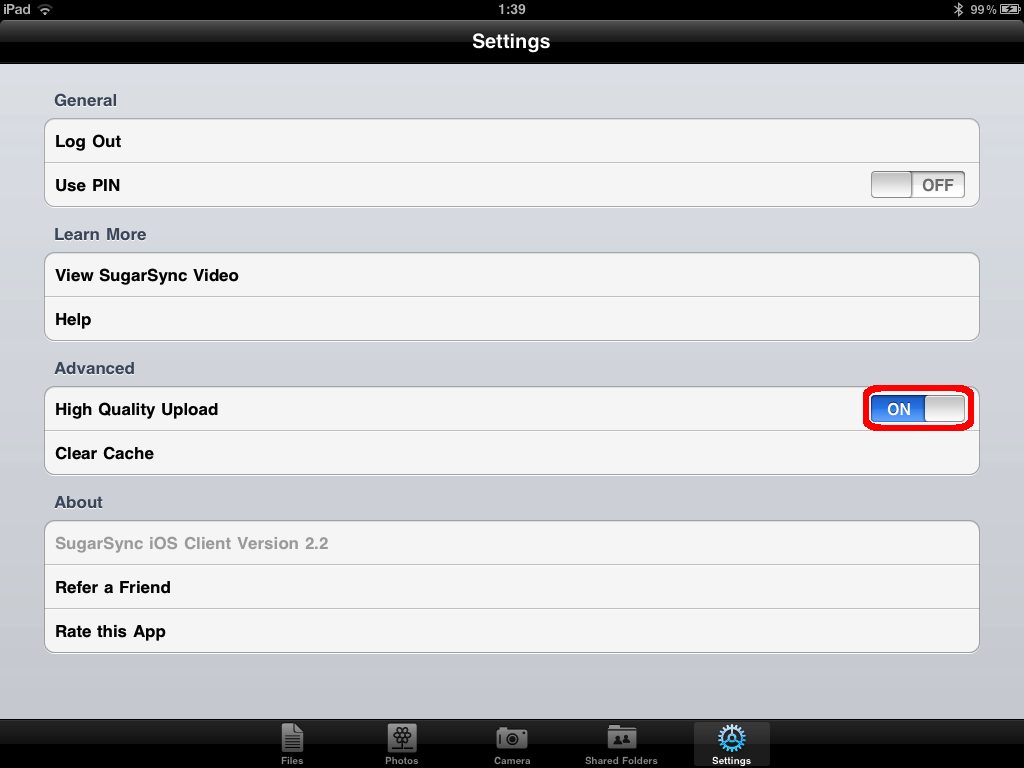 I toggled the High Quality Upload switch to the ON position.