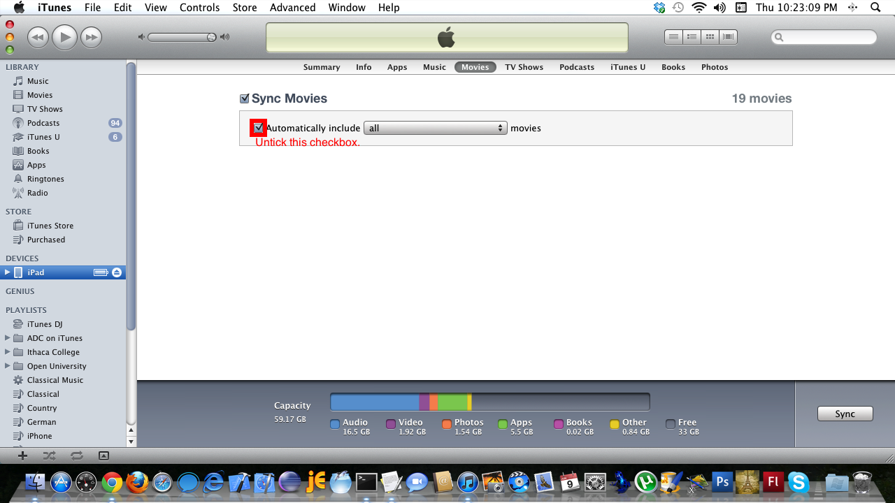 Any problems that occur during sync will be shown in a warnings window, untick options for that type. In my case movie files caused an issue, therefore I ensured that Automatically include all movies was blank, and all movies unticked/un-checkmarked.