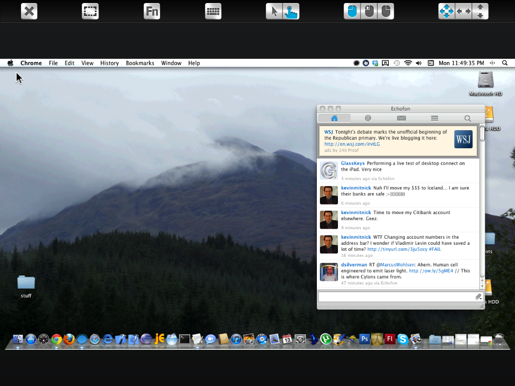 Pinching fingers together and releasing restored the full desktop view. To move the mouse pointer I tap once with my finger, move the cursor and tap again to “click” the mouse on the remote desktop.