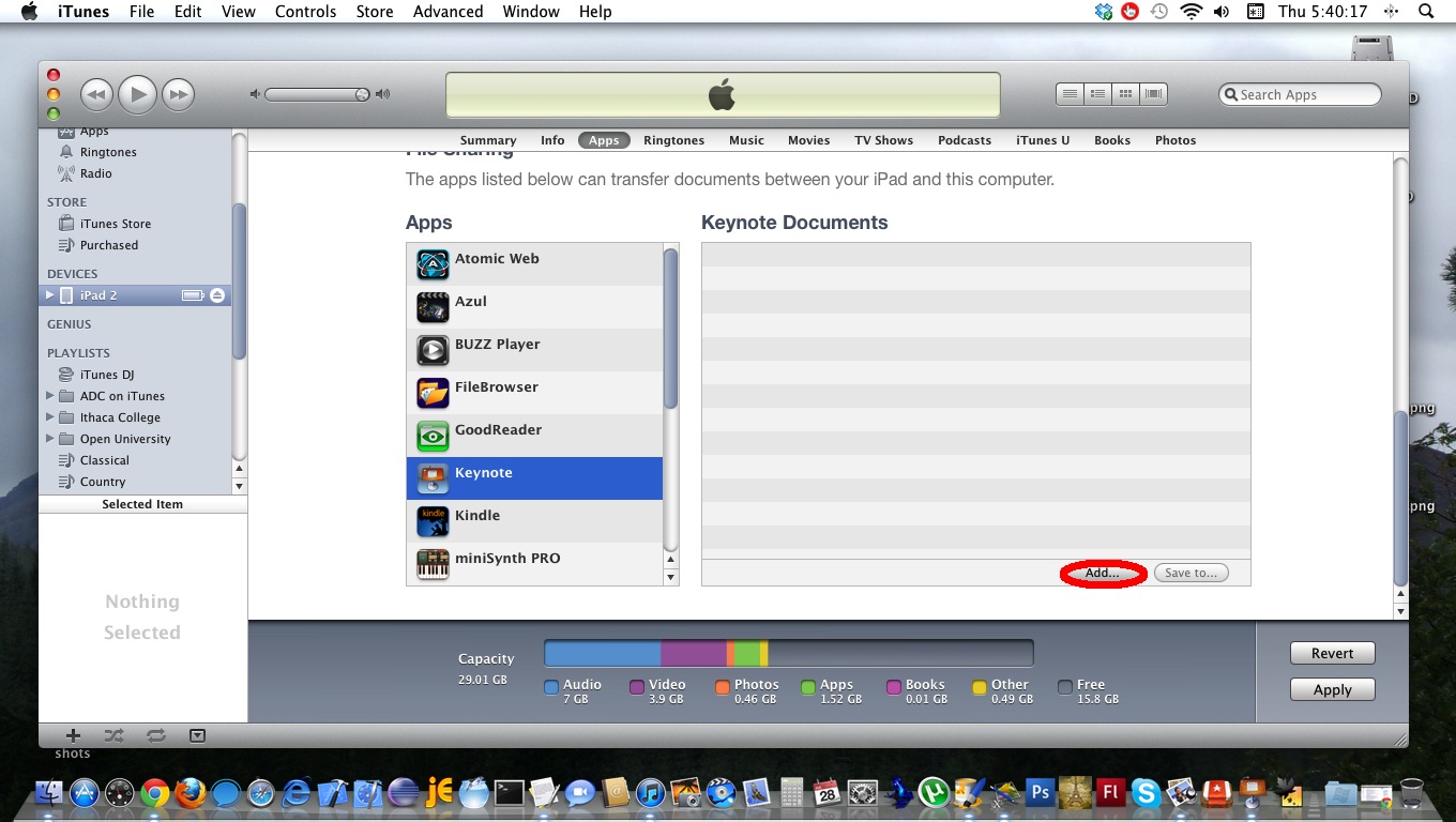 In iTunes, in the Apps tab, at the bottom File Sharing section select Keynote, then click the Add… button.