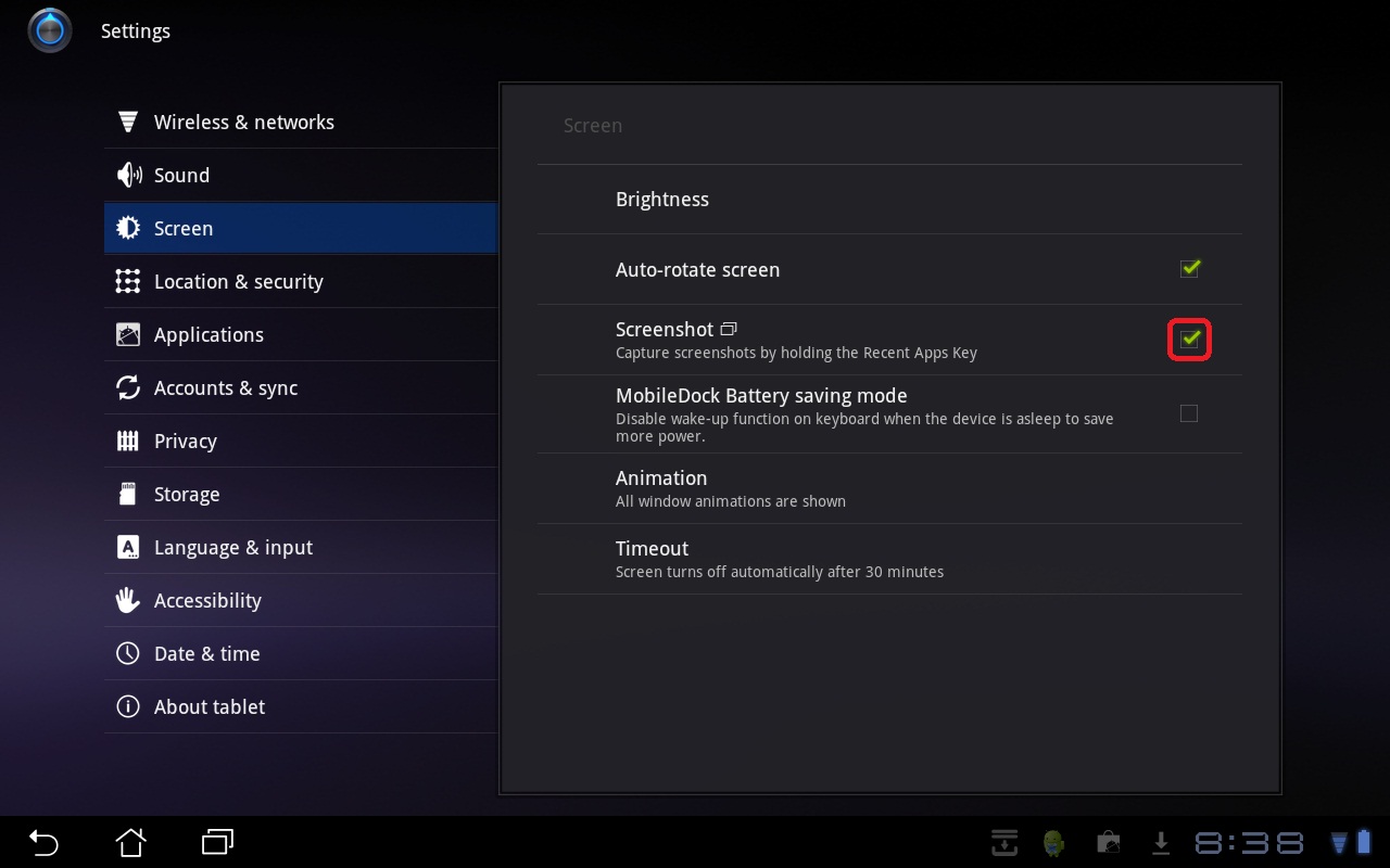 Ensure the Screenshot checkbox is ticked, found under the Screen section.