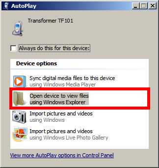 Attach a Honeycomb tablet to your Win 7 PC, then select the “Open device to view files using Windows Explorer” option in the Autoplay dialog.