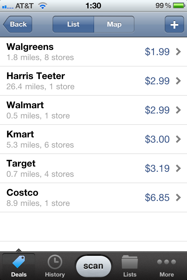 List of shops, price and distance.