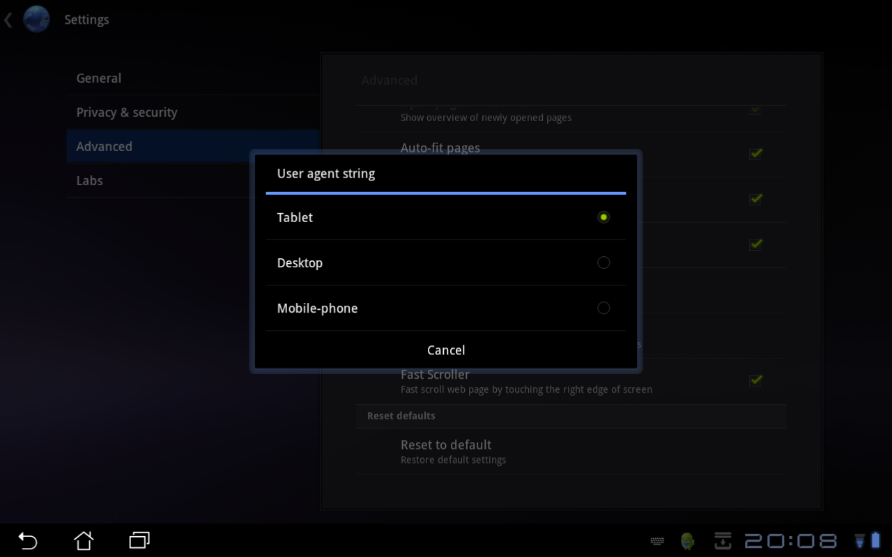 Tablet user agent string is default.