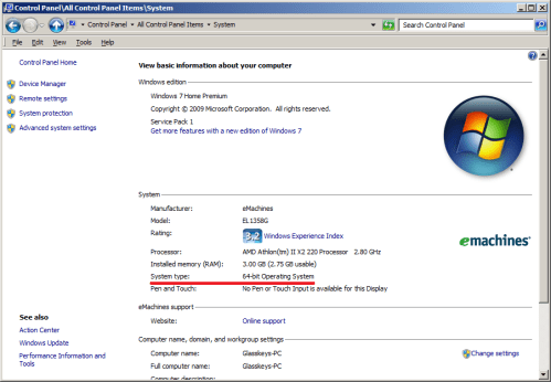 Under the System grouping, you will see System type, which kindly informs us if our system is a 32-bit or 64-bit operating system, as indicated in the red underlined portion of the screen shot: