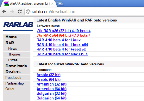 Now that we have come to terms with our Windows system type, you may close the Control Panel windows, and open your browser to pull the appropriate client from the Rarlab download page. Note that I clicked on the 64-bit link which matches my system type: