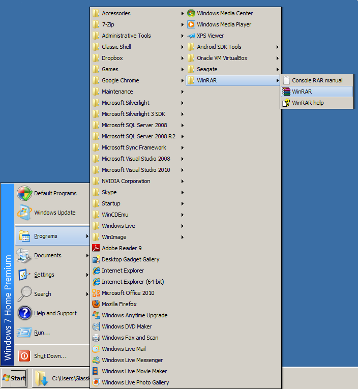 After installation, open WinRar, with a click on the Start button and a brave attempt to find it in the horrendous menu: