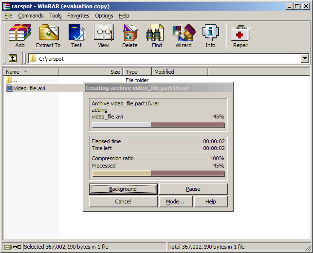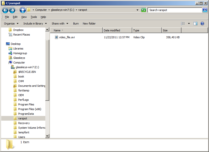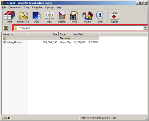 For purposes of demonstration, I have on my system a video file, appropriately named video_file.avi, residing in a folder called rarspot on my C:\ drive: