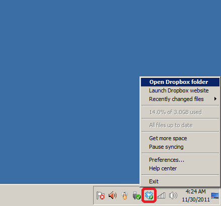 I now am going to create a folder on Dropbox specifically to hold this collection of RAR files. I start by clicking the Dropbox icon in the taskbar tray, and selecting the Open Dropbox folder menu item: