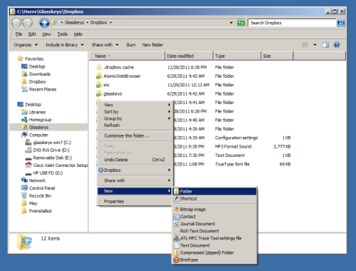 Windows Explorer will open to the Dropbox folder, right-click and select New, and Folder like the example screen shot, or you can simply click the New Folder button near the top of the folder if using Windows 7: