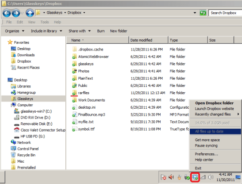Depending on your bandwidth speed, and other factors, Dropbox will need some time to copy all of the RAR files to their new home. So in other words, do not paste the files into the Dropbox rarfiles folder, immediately shut down your Windows box, and expect the files to all be found on Dropbox. The quickest way to ensure that they have all been transferred is to click the Dropbox system tray icon and look for the All files up to date caption. You can also tell by looking at the rarfiles folder icon in Explorer, as there will be a green tick mark next to it when Dropbox has fully synced all the contents: