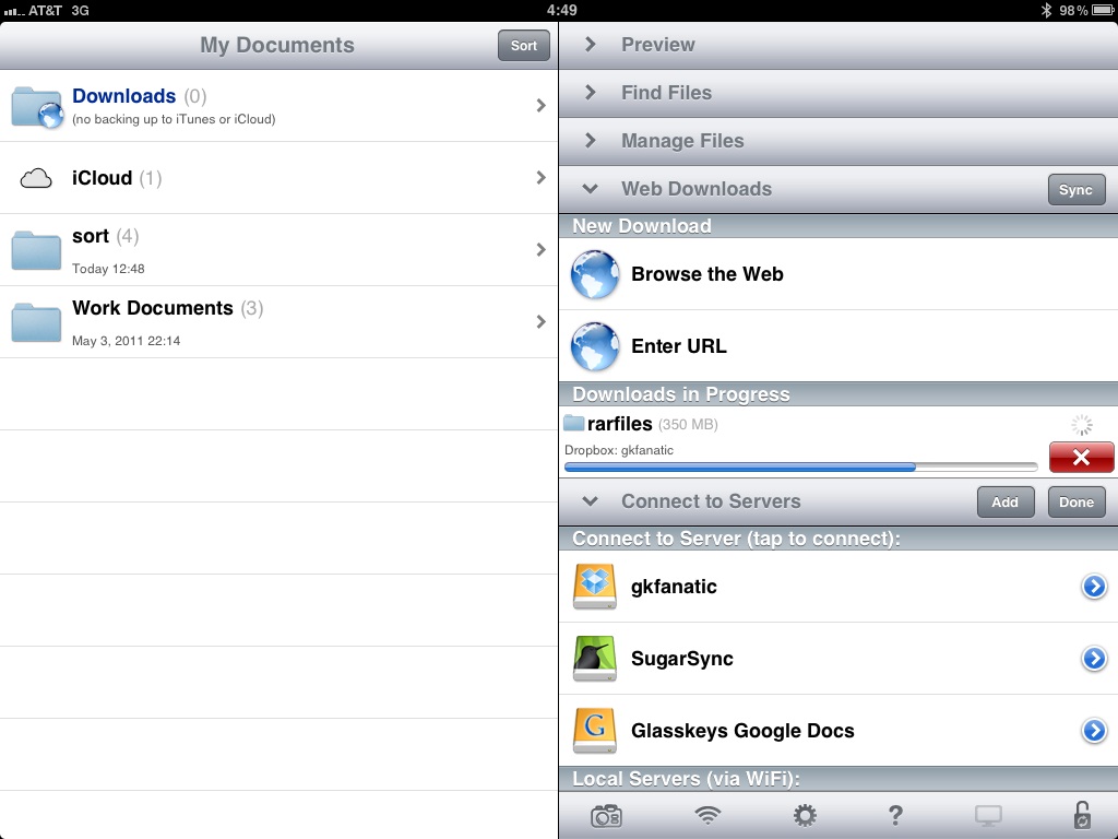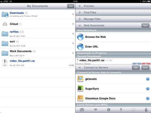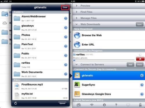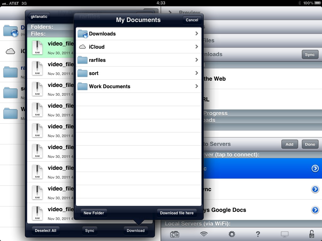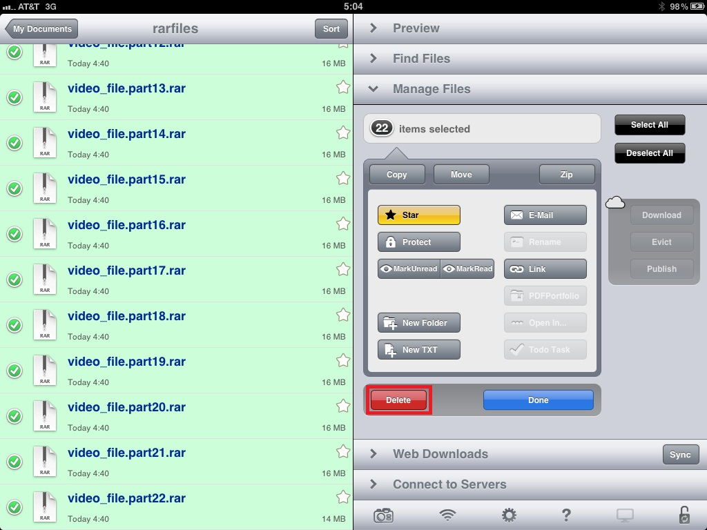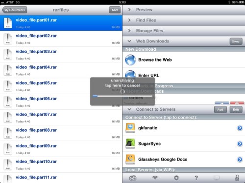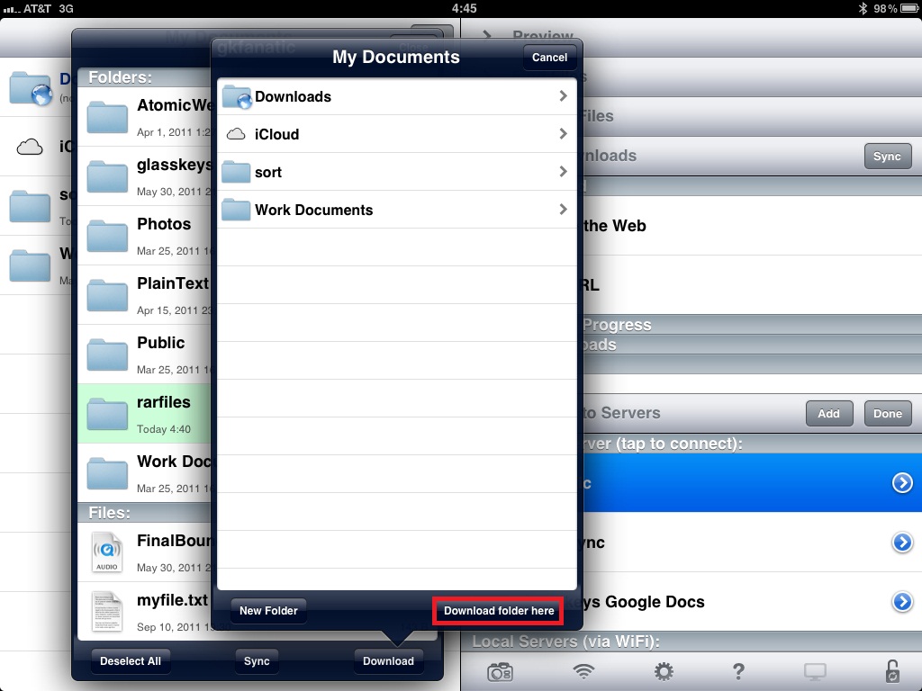 Tap the Connect to Servers category at right, then select your Dropbox account, the rarfiles folder, and tap the Download button: