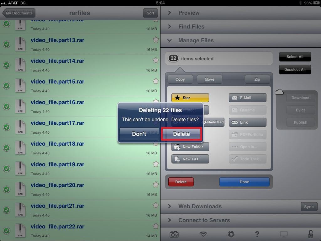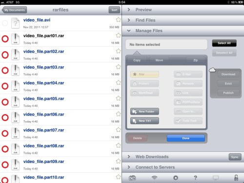 I am now watching the full sized video, split with WinRAR, downloaded from Dropbox via a 3G data connection, and recombined back into the original video file with GoodReader on the iPad. The final two screen shots illustrate how to download each RAR file individually. Please enjoy and take advantage of all of the flexibility that RAR files provide!