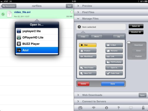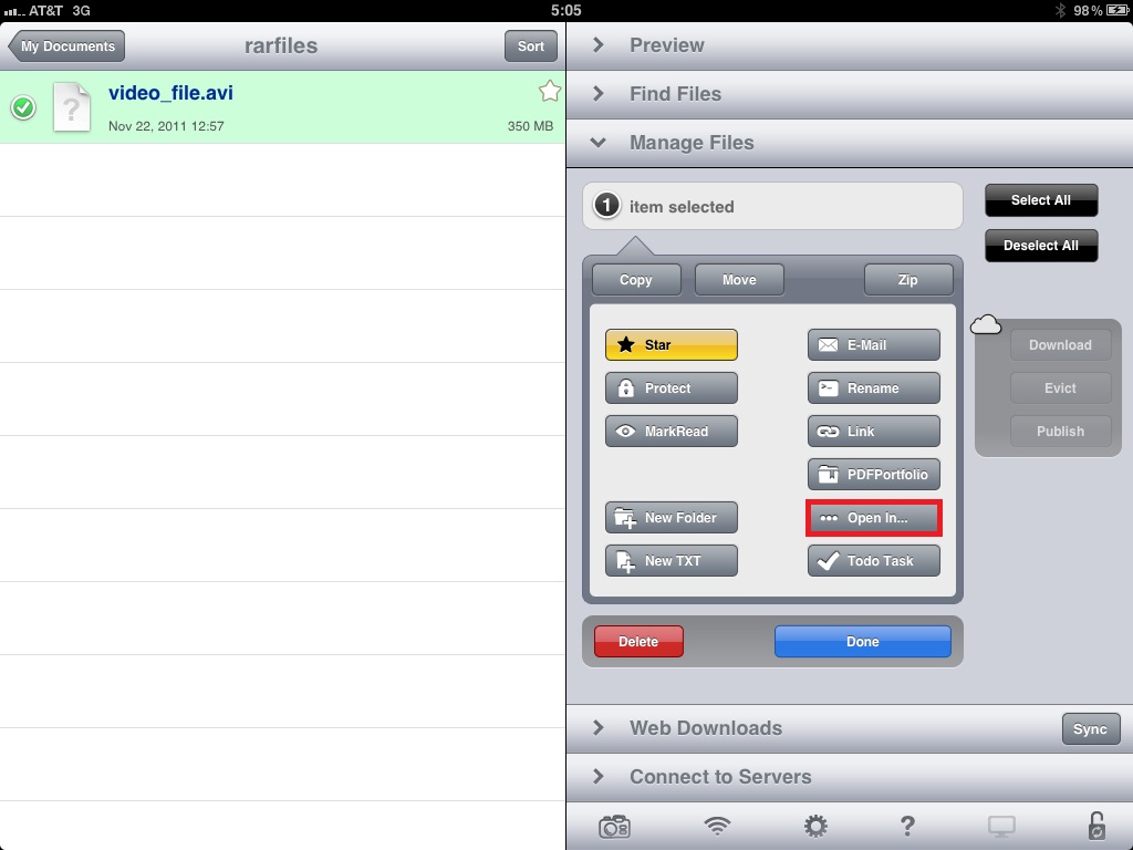 When done archiving, the video_file.avi has been created and is visible in the file list. Tap the Manage Files category on the right side of the GoodReader screen: