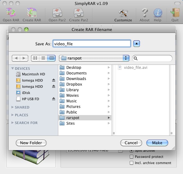 Enter video_file (or whatever floats your boat) in the Save As text box. I also selected rarspot as the destination folder: