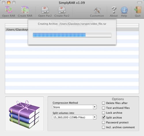 These settings instruct SimplyRAR to create RAR files of 15MB in size, with no compression (AKA Store) because attempting to compress binary files such as video usually result in larger file sizes and would be a rather silly thing to do.