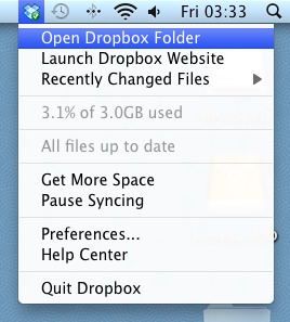 Now navigate to your Dropbox folder. The easy way to do this is to click the Dropbox icon on the top toolbar, then choosing the Open Dropbox Folder option in the menu: