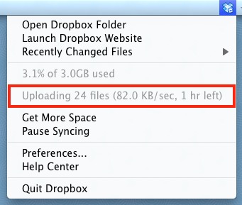 Depending on your bandwidth speed and other factors, Dropbox will need some time to copy all of the RAR files to their new home. So in other words, do not paste the files into the Dropbox rarfiles folder, immediately shut down your Mac, and expect the files to all be found on Dropbox. The quickest way to ensure that they have all been transferred is to click the Dropbox system tray icon and look for the All files up to date caption. If you see the Uploading files caption, you need to wait a bit: