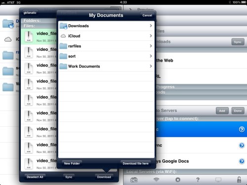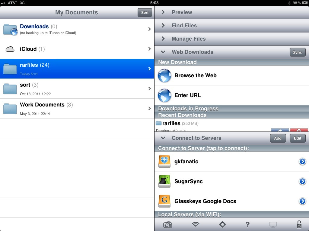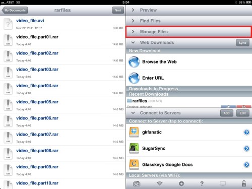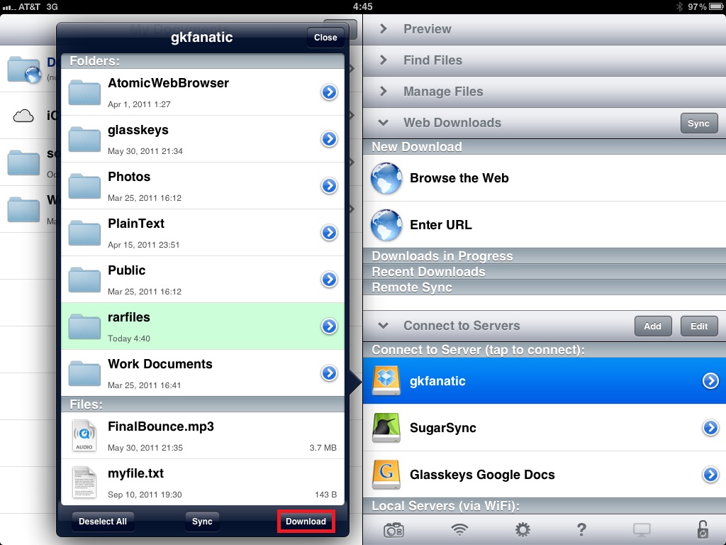 Tap the Connect to Servers category at right, then select your Dropbox account, the rarfiles folder, and tap the Download button: