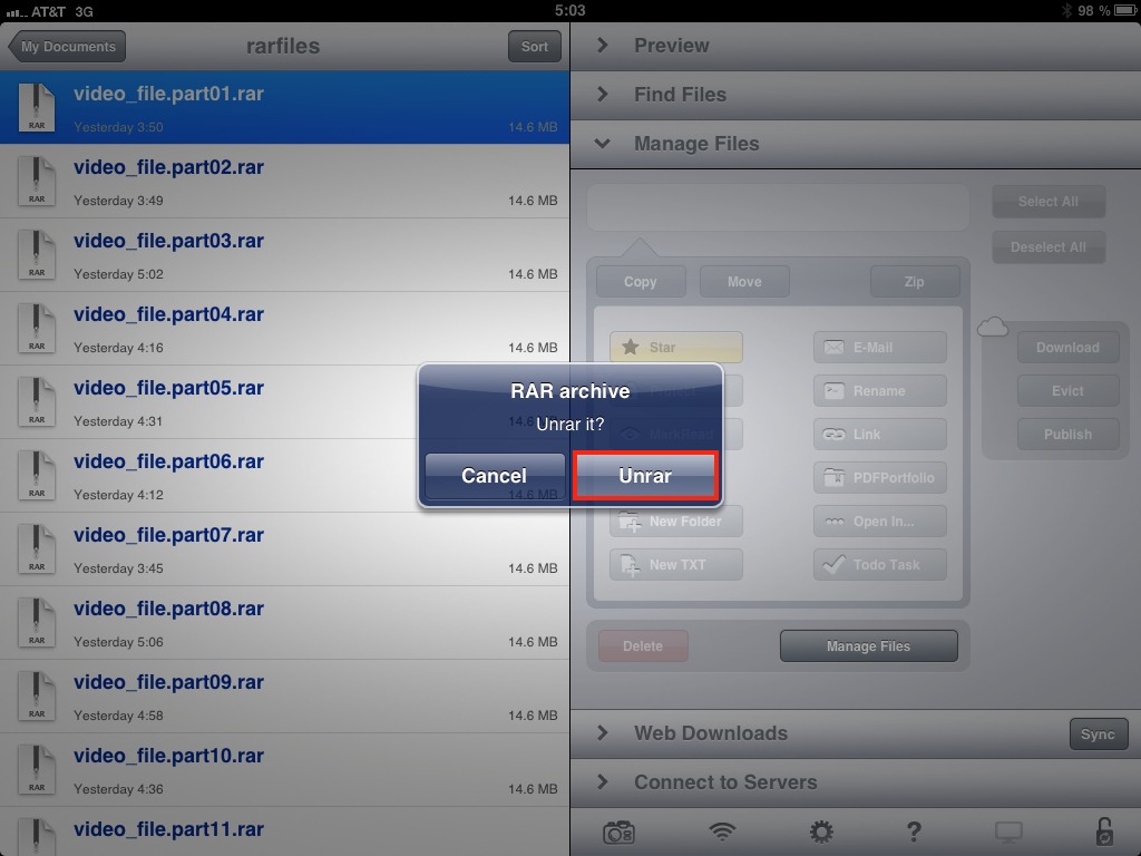 …then the video_file.part01.rar file. When presented with the RAR archive dialog, tap the Unrar button: