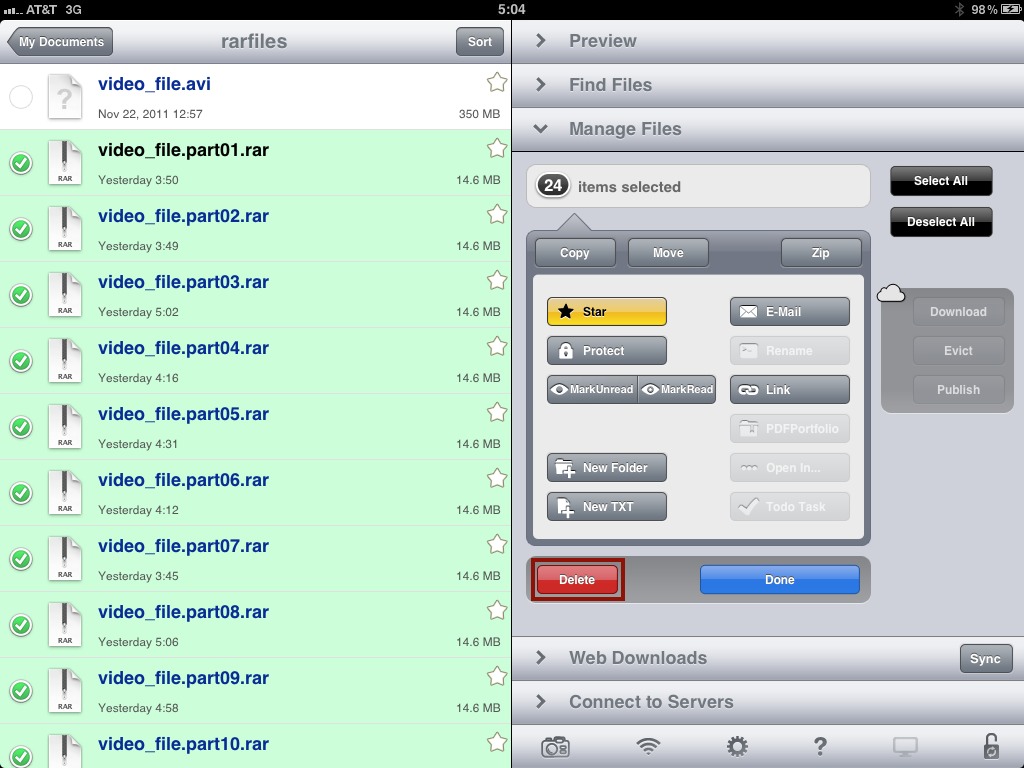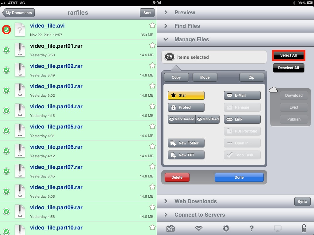 I am now watching the full sized video, split with SimplyRAR, downloaded from Dropbox via a 3G data connection, and recombined back into the original video file with GoodReader on the iPad. The final two screen shots illustrate how to download each RAR file individually. Please enjoy and take advantage of all of the flexibility that RAR files provide!