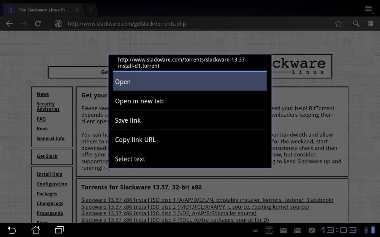 After the torrent link is clicked the browser needs to know what to do with the .torrent file. At this point tap the Open option.