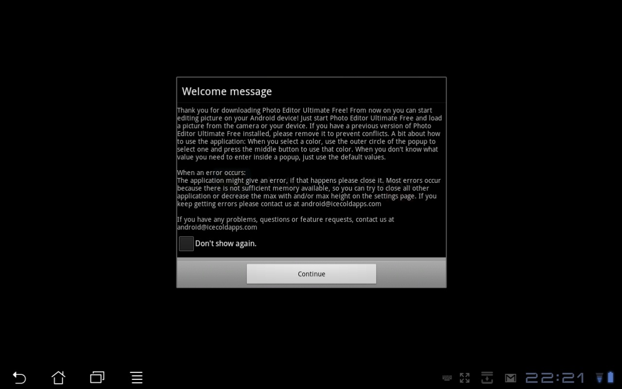 The “Welcome message” and first of many messages you will see whilst using Photo Editor Ultimate Free.