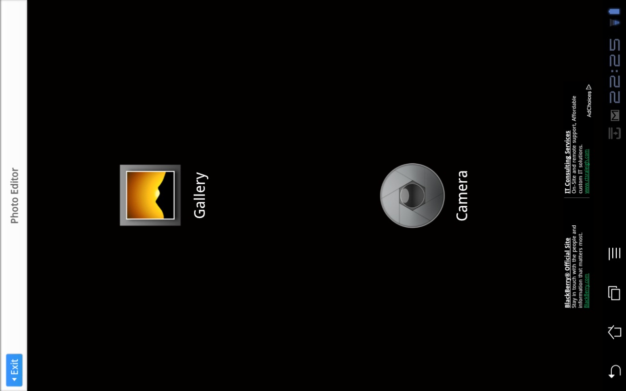 Photo Editor main menu. The application must be used in portrait mode. Images are easily retrieved via the Gallery function, or a new image may be taken with the Camera on the main menu.
